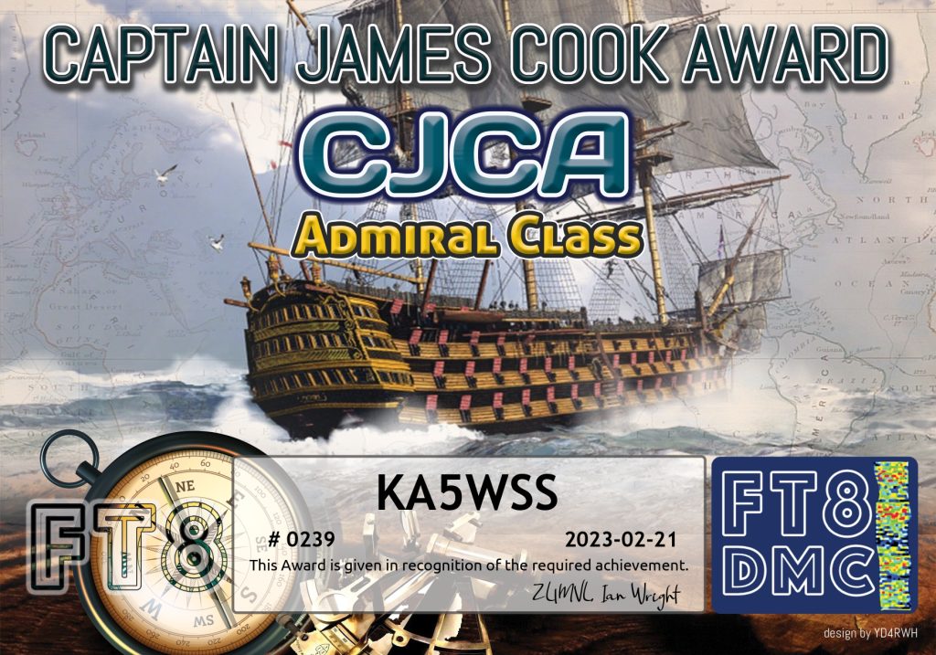 To apply for the Captain James Cook Award, and all other FT8DMC awards, you must install the UltimateAAC application on a Windows machine. That application scans your WSJT-X ADIF log file and will inform you when you’ve qualified for the award at various levels. FT8DMC issues the award in digital form only (JPG or PDF) with no printing or shipping costs. In fact, the award is completely free, like all of their other awards.
